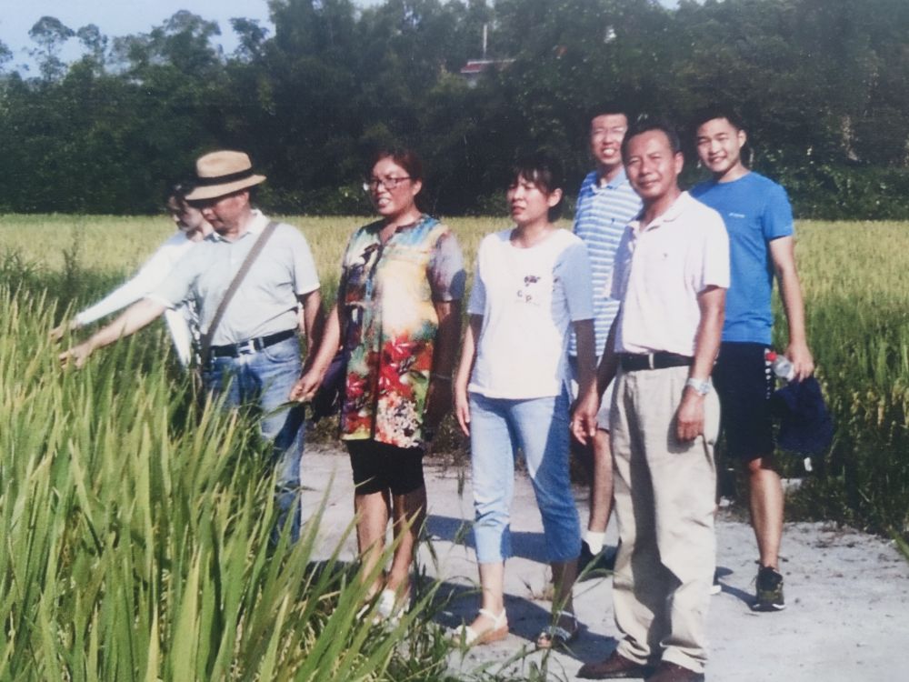2014年,馬均(右二)帶領(lǐng)學(xué)生在永豐村與當(dāng)?shù)剞r(nóng)技人員交流。