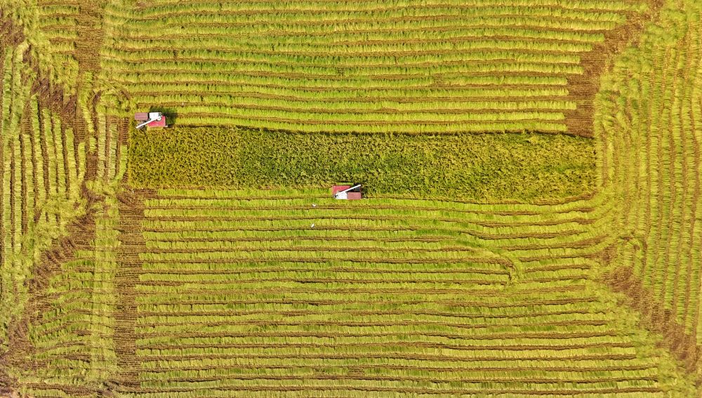 2024年8月22日,收割機(jī)在永豐村高標(biāo)準(zhǔn)農(nóng)田內(nèi)收割水稻(無人機(jī)照片)。團(tuán)隊(duì)預(yù)計(jì),2024年永豐村高標(biāo)準(zhǔn)農(nóng)田平均畝產(chǎn)將接近800公斤。