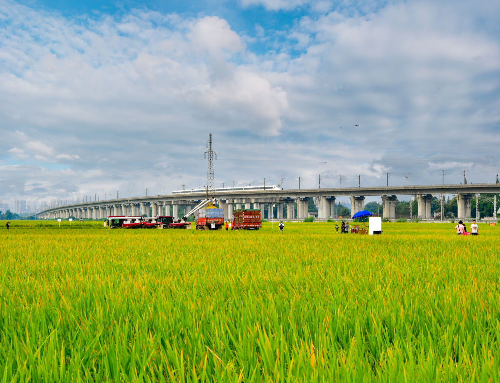 2024年7月26日,一列高鐵列車從永豐村高標(biāo)準(zhǔn)農(nóng)田上方的高架橋上疾馳而過(無人機(jī)照片)。過去,永豐村的農(nóng)田不少是“巴掌田”“雞爪田”,如今,細(xì)碎零散的耕地變成了“田成方、土成型、渠成網(wǎng)、路相通、溝相連”的高標(biāo)準(zhǔn)農(nóng)田,連片農(nóng)田實(shí)現(xiàn)了全程機(jī)械化種植。