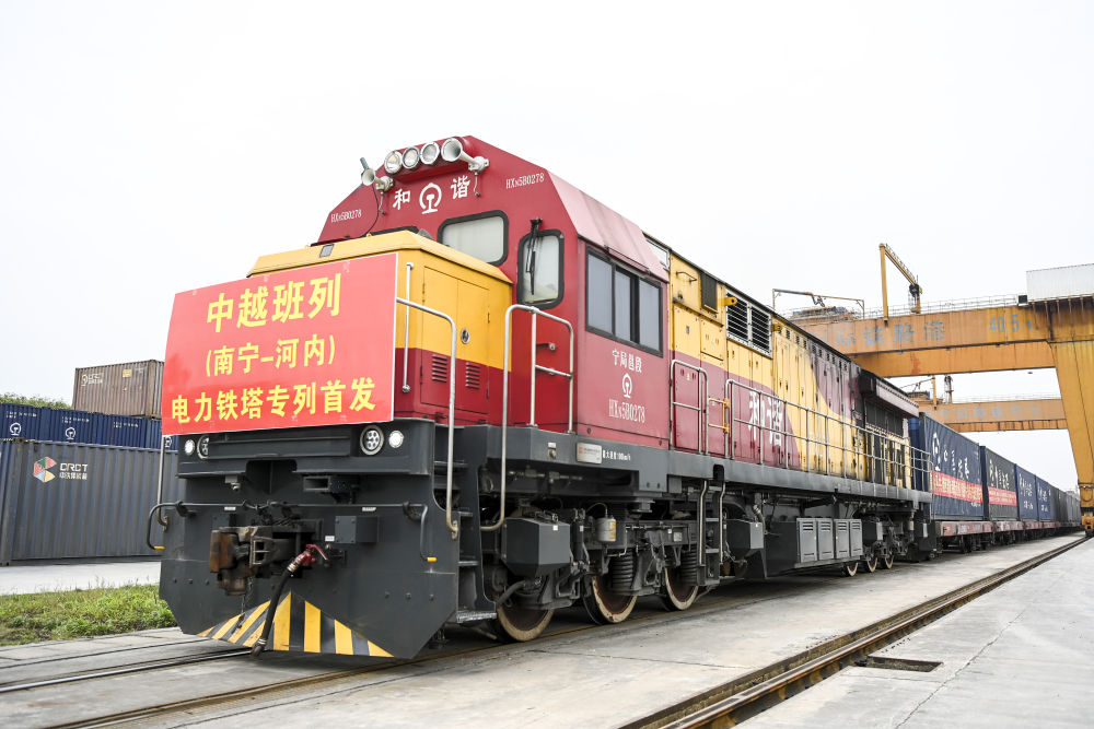 2024年3月8日,在南寧國際鐵路港,一列中越班列準備發(fā)往越南河內(nèi)。西部陸海新通道鐵海聯(lián)運班列和中歐班列、中越班列、中老鐵路等相互銜接聯(lián)通,搭建起“多向延伸、海陸互聯(lián)”的運輸服務網(wǎng)絡,中國西部地區(qū)面向東盟的國際大通道日趨通達。