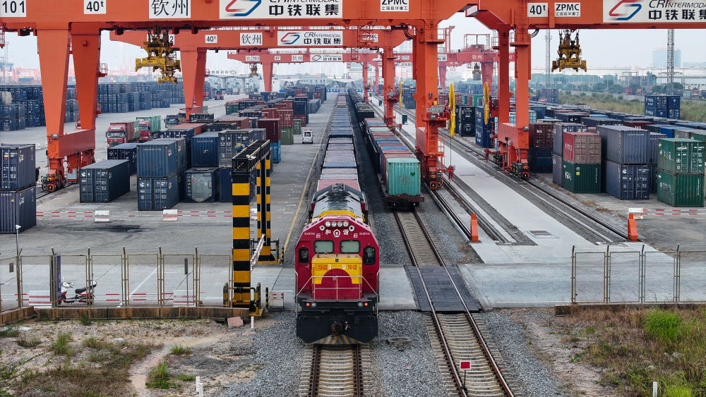 西部陸海新通道鐵海聯(lián)運班列從欽州港東站駛出(2024年5月12日攝,無人機照片)。隨著中國-東盟開放平臺建設向縱深推進,西部陸海新通道正在成為釋放開放活力的強力新引擎,以物流為切入口,促進資金、資源、人員、技術等生產(chǎn)要素深度融合。