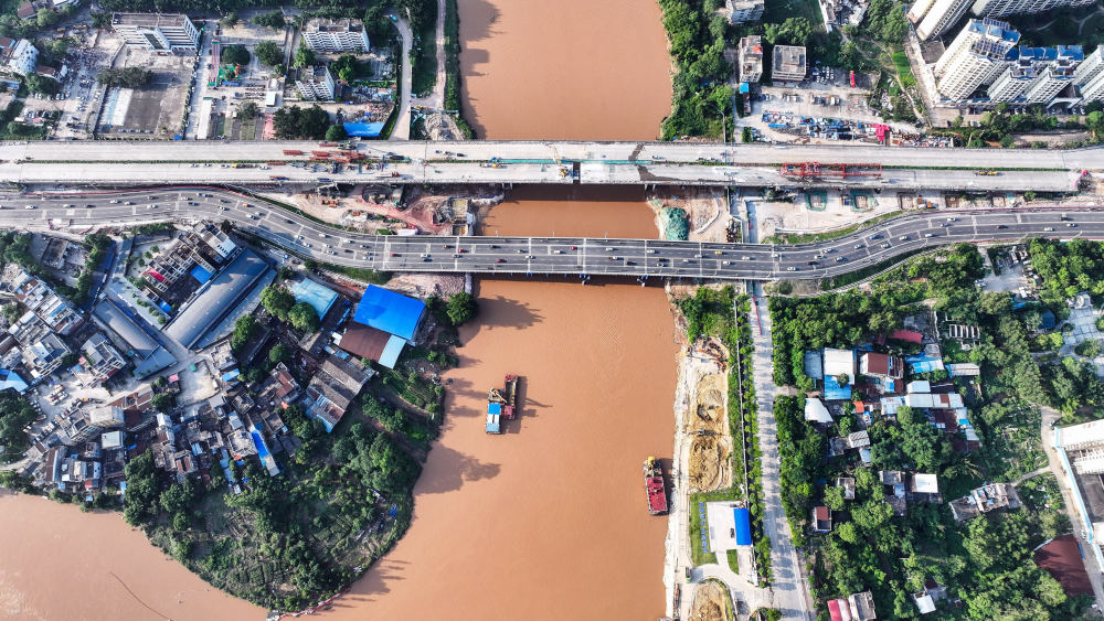 施工隊在廣西欽州市拆舊橋建新橋,疏浚平陸運河流經(jīng)欽州市區(qū)的航道(2024年5月12日攝,無人機照片)。平陸運河建成后將成為廣西及西南地區(qū)通往東盟地區(qū)運距最短、最便捷的水運出海通道。