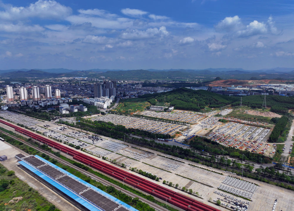 汽車在廣西柳州雒容汽車物流基地等待進入鐵路貨車車廂。部分出口的新能源汽車從這里裝車運往各大出海港口(2024年5月24日攝,無人機照片)。