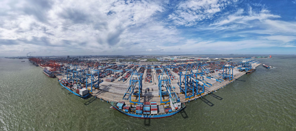 2024年6月13日,途經(jīng)馬來西亞關丹港的“海豐博多”輪在廣西欽州港集裝箱裝卸自動化碼頭進行裝卸作業(yè)(無人機全景照片)。