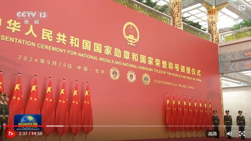 人民大會(huì)堂金色大廳,氣氛莊重?zé)崃摇>薹t色背景板上,共和國勛章、友誼勛章和國家榮譽(yù)稱號(hào)獎(jiǎng)?wù)聢D案熠熠生輝。背景板前,18面鮮艷的五星紅旗分列兩側(cè),18名英姿挺拔的禮兵持槍佇立。
