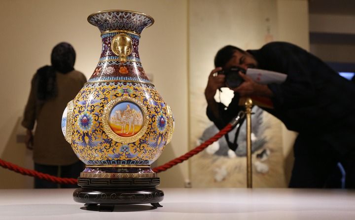 2024年10月12日,在伊朗首都德黑蘭的馬利克國家博物館,觀眾在“絲路長云——中國藝術(shù)文化精品展”現(xiàn)場拍攝展品。新華社記者 沙達提 攝