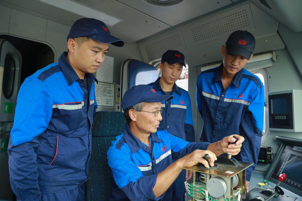 在中老鐵路萬象運營管理中心的機車檢修庫里,中老師徒4人一同對機車部件進行攻關(2024年9月9日攝)。新華社發(fā)(鄭皓文攝)