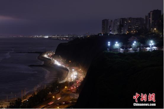 當?shù)貢r間11月12日,秘魯首都利馬的海邊夜景。中新社記者 盛佳鵬 攝