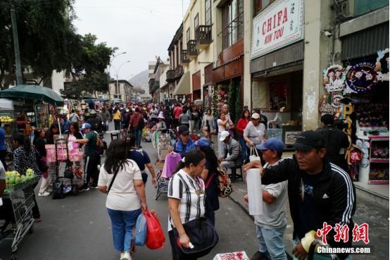 當?shù)貢r間11月12日,秘魯首都利馬,唐人街上推銷商品的小販。中新社記者 盛佳鵬 攝