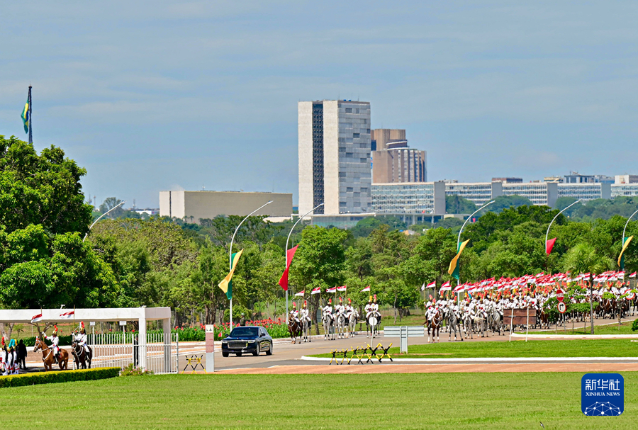 初夏時(shí)節(jié)的巴西利亞,天朗氣清。黎明宮內(nèi),綠草如茵,450名威武禮兵整齊列隊(duì)。在120名龍騎兵護(hù)衛(wèi)下,習(xí)近平乘車抵達(dá)黎明宮前廣場。