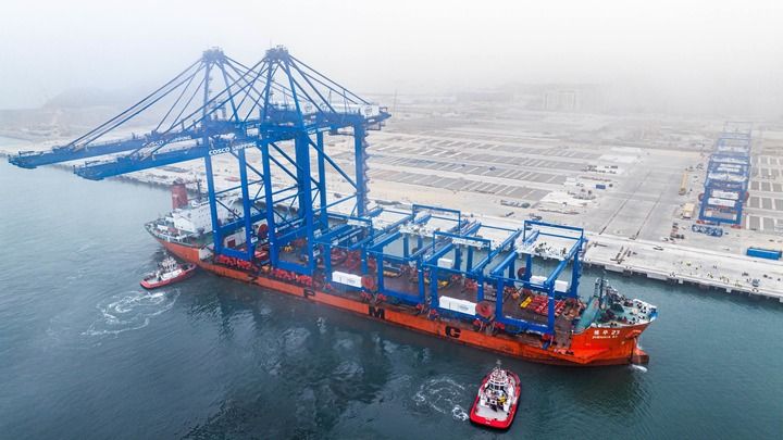 6月27日,岸邊集裝箱起重機(jī)和軌道吊運抵秘魯錢凱港。新華社發(fā)(上海振華重工供圖)
