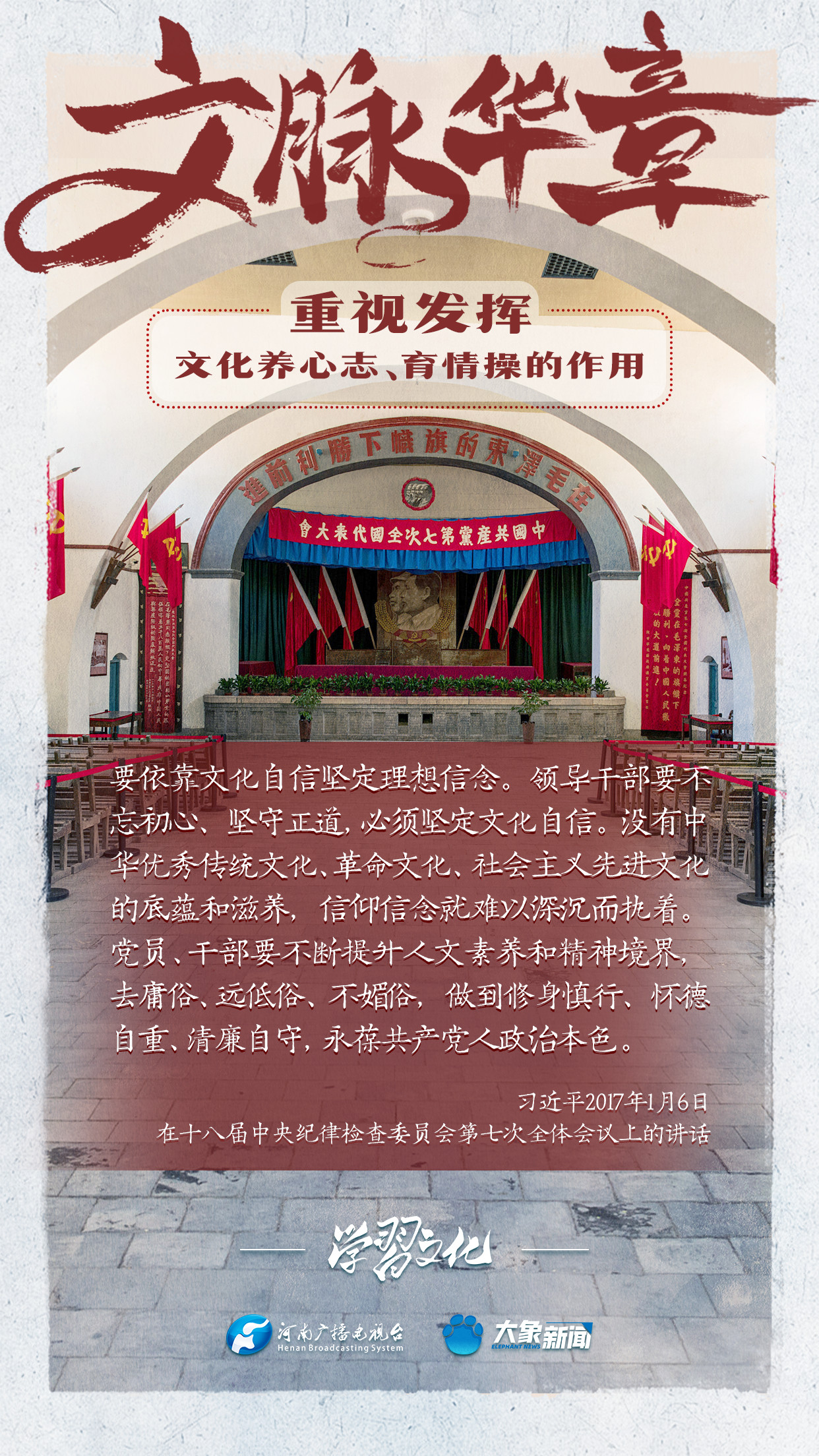 習(xí)近平總書記在主持中共中央政治局第十七次集體學(xué)習(xí)時(shí)強(qiáng)調(diào),重視發(fā)揮文化養(yǎng)心志、育情操的作用,涵養(yǎng)全民族昂揚(yáng)奮發(fā)的精神氣質(zhì)??倳浉叨戎匾曃幕淖饔?,發(fā)表了一系列重要講話,倡導(dǎo)以文載道、以文傳聲、以文化人。我們一起學(xué)習(xí)。