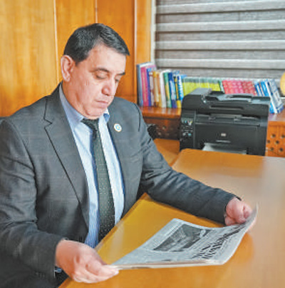蘇赫羅普·勞夫佐達(dá)閱讀塔吉克斯坦《人民論壇報(bào)》與中國(guó)相關(guān)的報(bào)道。劉帥杰攝