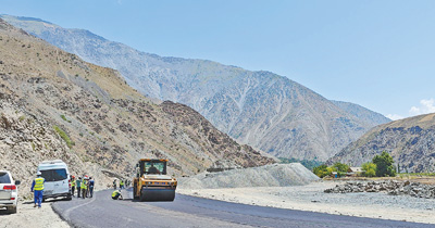 中塔公路二期項(xiàng)目建設(shè)現(xiàn)場(chǎng),兩國(guó)工作人員正在平整瀝青路面。本報(bào)記者 程是頡攝