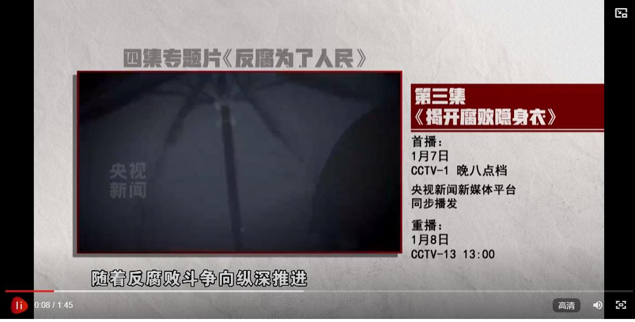 【解說(shuō)詞】《反腐 為了人民》第三集《揭開(kāi)腐敗隱身衣》,敬請(qǐng)關(guān)注。