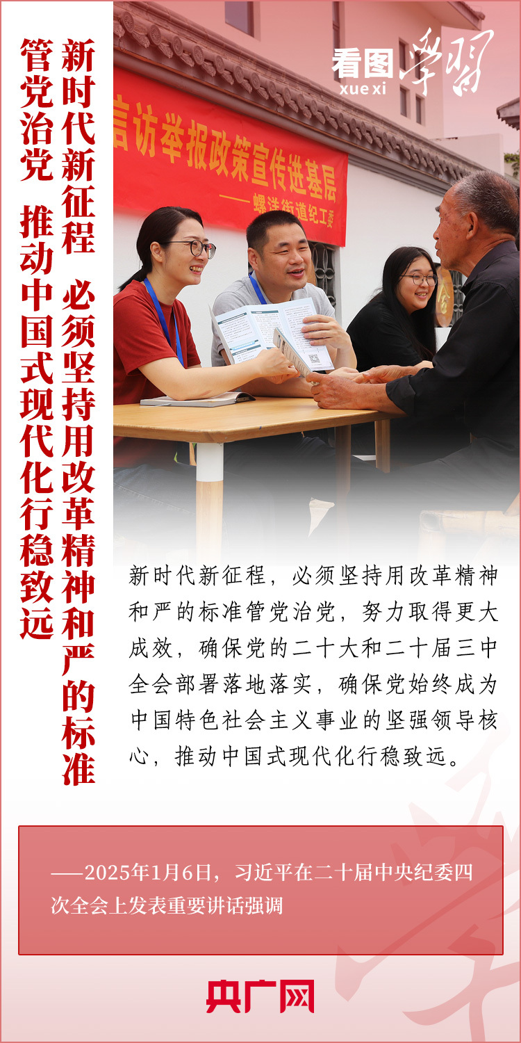 1月6日,習(xí)近平總書記在二十屆中央紀(jì)委四次全會(huì)上發(fā)表重要講話,充分肯定過去一年全面從嚴(yán)治黨取得的新進(jìn)展、新成效,深刻分析當(dāng)前反腐敗斗爭形勢,對(duì)堅(jiān)決打好反腐敗斗爭攻堅(jiān)戰(zhàn)、持久戰(zhàn)、總體戰(zhàn)提出明確要求。總書記強(qiáng)調(diào),新時(shí)代新征程,必須堅(jiān)持用改革精神和嚴(yán)的標(biāo)準(zhǔn)管黨治黨,努力取得更大成效,確保黨的二十大和二十屆三中全會(huì)部署落地落實(shí),確保黨始終成為中國特色社會(huì)主義事業(yè)的堅(jiān)強(qiáng)領(lǐng)導(dǎo)核心,推動(dòng)中國式現(xiàn)代化行穩(wěn)致遠(yuǎn)。一起來學(xué)習(xí)!