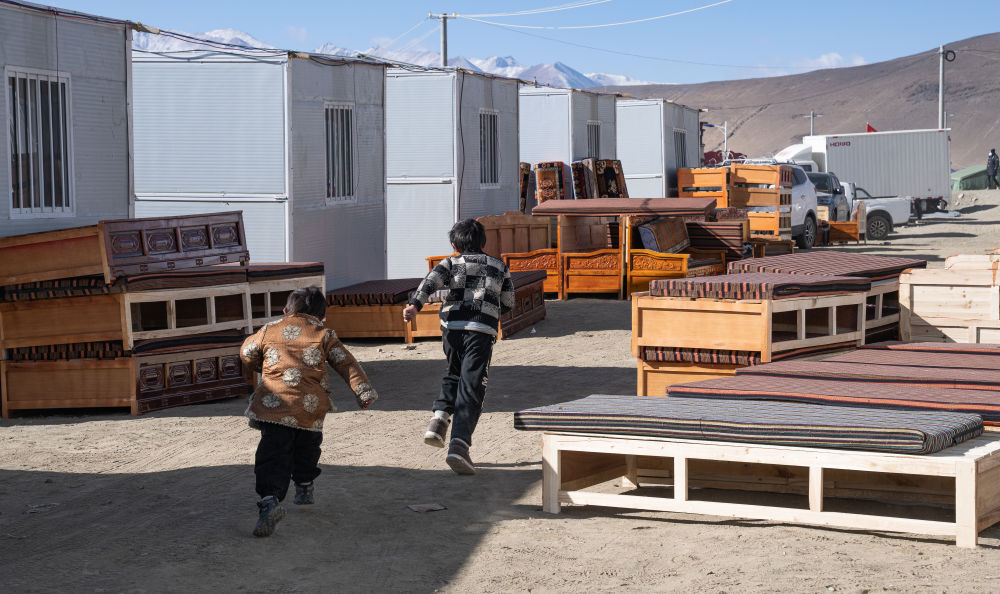 2025年1月13日,在定日縣嘎旦村,兩個(gè)孩子在剛運(yùn)來(lái)的兩排藏床間奔跑。新華社記者丁增尼達(dá) 攝