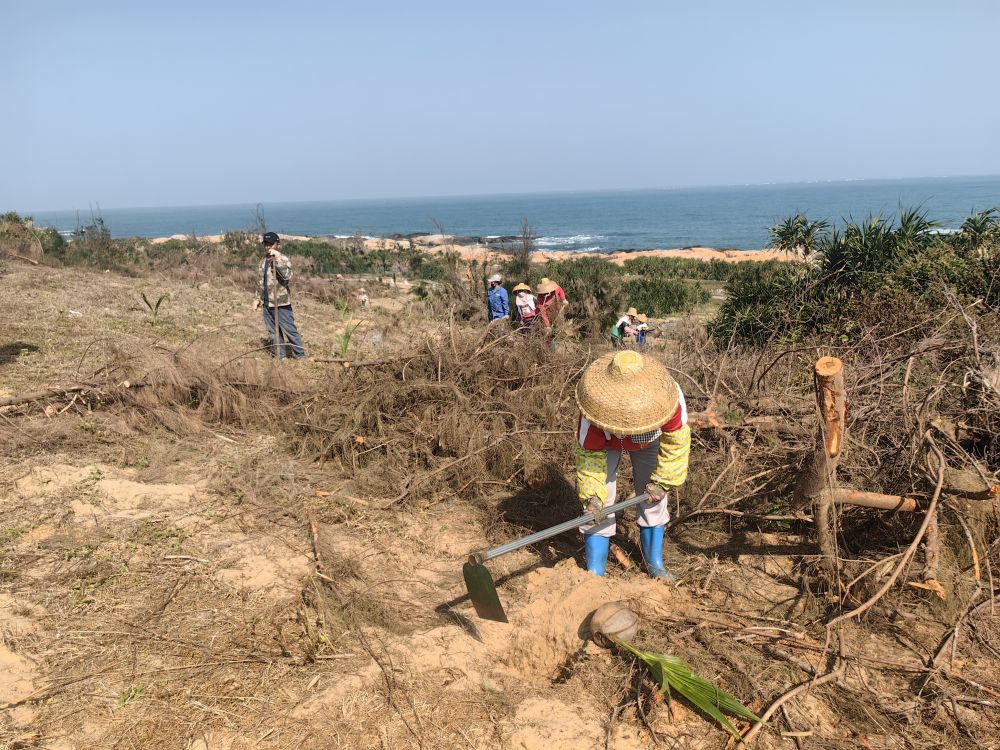 “和原來(lái)的木麻黃樹相比,椰子樹不僅抗風(fēng)能力更強(qiáng),也更加美觀。”工人韓吉衍嫻熟地將一鍬紅土鏟到剛種下的椰苗根部,并輕輕拍打夯實(shí),“這一片椰林要種280畝,我們每天干八九個(gè)小時(shí),這幾天就要種完。”