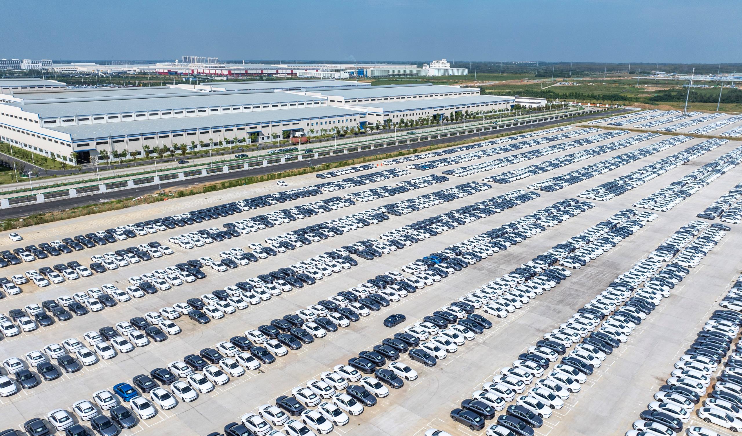 2024年9月,安徽合肥,整齊停放的新能源汽車正在等待裝車銷往國內(nèi)外市場。