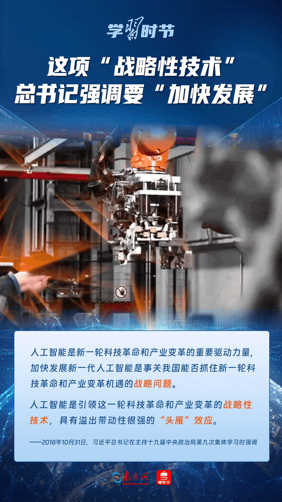 人工智能是引領(lǐng)科技革命和產(chǎn)業(yè)變革的戰(zhàn)略性技術(shù)。黨的十八大以來,習(xí)近平總書記把創(chuàng)新擺在國家發(fā)展全局的核心位置,高度重視人工智能發(fā)展,多次談及這項(xiàng)“戰(zhàn)略性技術(shù)”,強(qiáng)調(diào)要“加快發(fā)展”,為人工智能賦能千行百業(yè)指明方向。讓我們一起來學(xué)習(xí)總書記關(guān)于人工智能的重要論述!