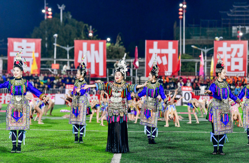2025年3月14日,2025年貴州“村超”40強(qiáng)交叉賽在榕江“村超”足球場(chǎng)舉行,演員在比賽間隙表演侗族大歌,民族文化伴隨著體育賽事成功“出圈”。