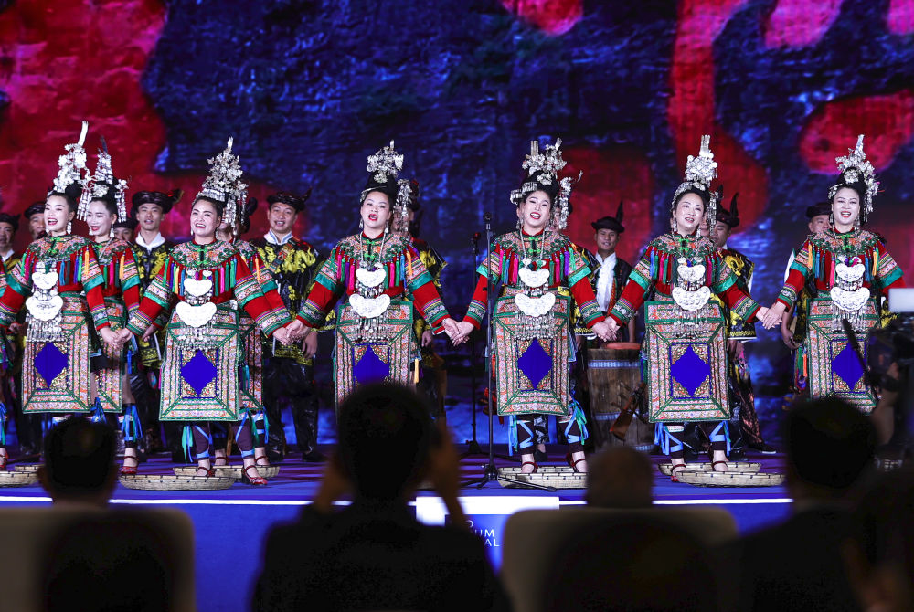2023年7月9日,演員在2023年生態(tài)文明貴陽國(guó)際論壇閉幕式上演唱侗族大歌。