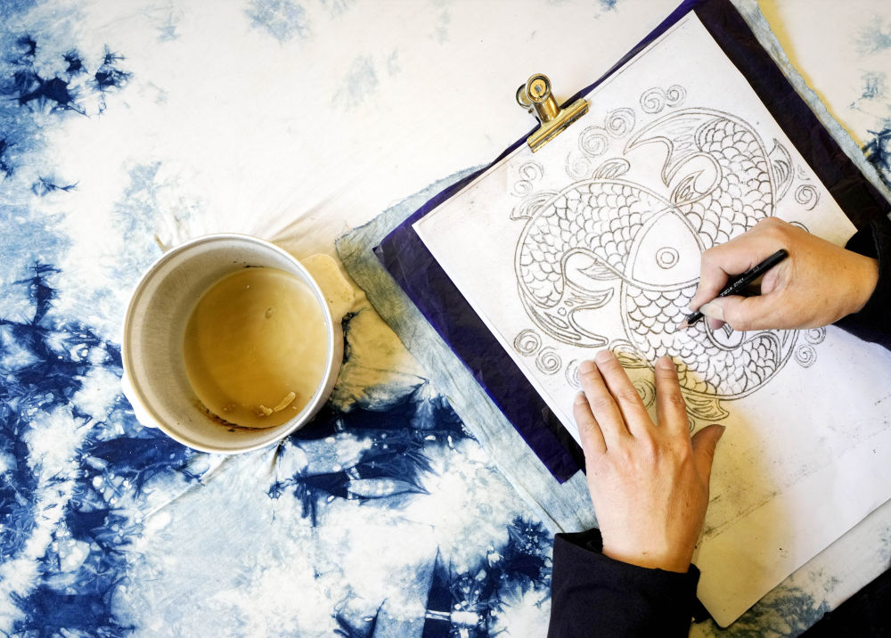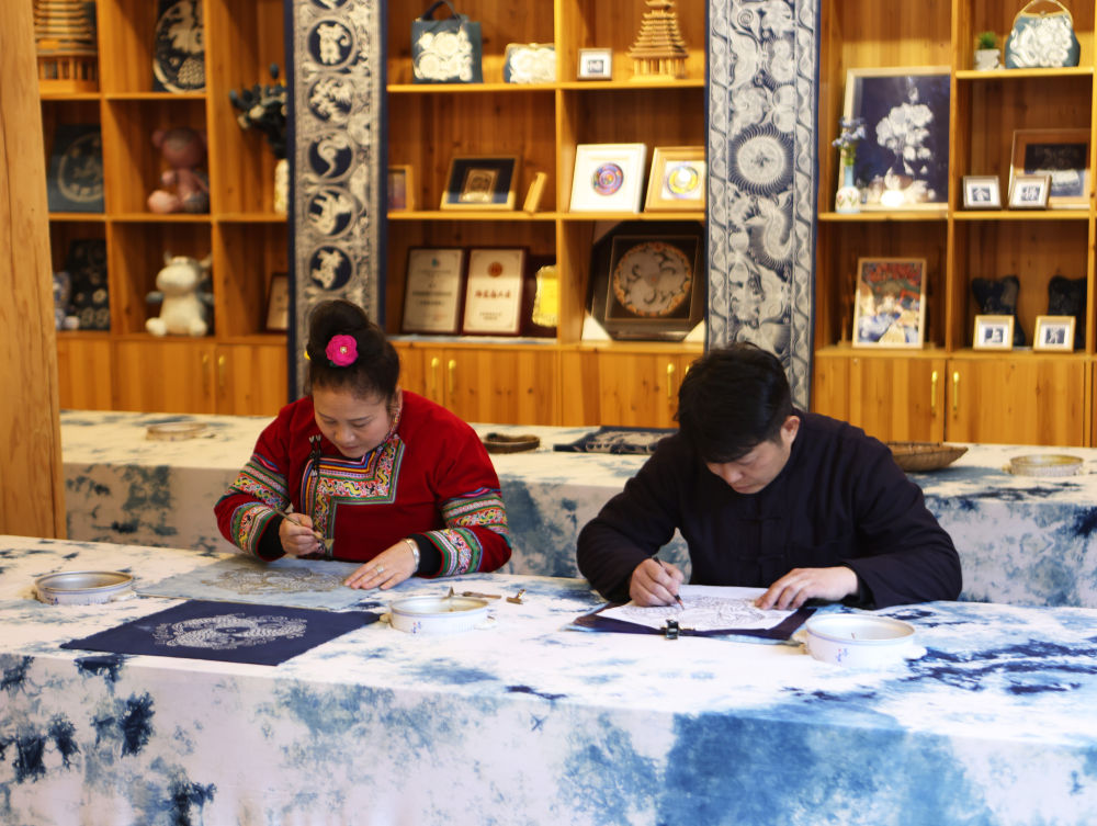 2025年3月14日,村民在肇興侗寨內(nèi)制作蠟染。近年來,當(dāng)?shù)丶哟髮?duì)少數(shù)民族非遺文創(chuàng)產(chǎn)品的研發(fā)和創(chuàng)新力度,同時(shí)進(jìn)一步加強(qiáng)線上銷售,通過微信、網(wǎng)上直播、網(wǎng)店等方式進(jìn)行帶貨,讓當(dāng)?shù)厝罕娡ㄟ^指尖增收致富。