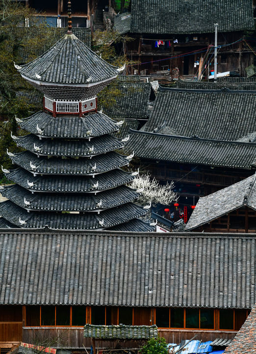 2024年3月17日拍攝的貴州省榕江縣栽麻鎮(zhèn)大利侗寨鼓樓。鼓樓是侗族的文化符號(hào)之一,每個(gè)侗寨至少有一座,是侗族人民集中議事、評(píng)斷是非的公共場(chǎng)所,也是侗家人出生和去世時(shí)必須要停留的場(chǎng)地。