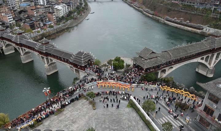 2024年2月22日,在貴州省黔東南苗族侗族自治州錦屏縣,舞龍隊(duì)經(jīng)過兩座風(fēng)雨橋的交匯處。風(fēng)雨橋,又稱“花橋”,是侗族的標(biāo)志性建筑之一。因橋上建有廊和亭,既可行人又可遮蔽風(fēng)雨,故稱風(fēng)雨橋。其以木為料、以榫銜接,是侗族橋梁建筑藝術(shù)的結(jié)晶。鼓樓、花橋的侗族木構(gòu)建筑營(yíng)造技藝被列入國(guó)家級(jí)非物質(zhì)文化遺產(chǎn)代表性項(xiàng)目。