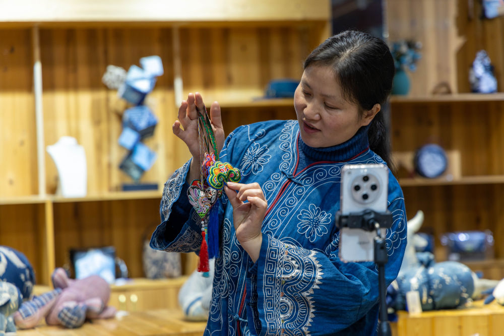 2025年3月14日,村民在肇興侗寨內(nèi)通過手機(jī)直播銷售刺繡作品。侗繡承載著侗族人的信仰與記憶,年輕繡娘的手藝多半來自母親傳承,侗族婦女用一針一線將民族古老的神話傳說、歷史風(fēng)俗記錄在服飾的紋樣里,讓這門手藝在侗鄉(xiāng)世代傳承。2011年,侗族刺繡被列入國(guó)家級(jí)非物質(zhì)文化遺產(chǎn)名錄。