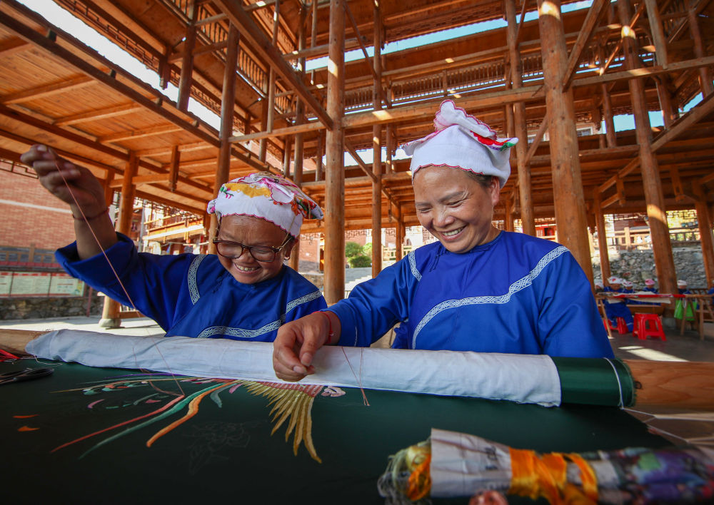 2021年9月27日,貴州省鎮(zhèn)遠(yuǎn)縣報(bào)京鄉(xiāng)報(bào)京村村民邰木香(右)在制作侗繡。邰木香將侗族的民間故事以刺繡形式展現(xiàn)出來,還先后開發(fā)出傳統(tǒng)與現(xiàn)代相結(jié)合的侗族服飾、工藝包、繡花鞋、圍腰、頭巾、枕巾等系列產(chǎn)品,深受國(guó)內(nèi)外客商的青睞,致富的同時(shí)帶動(dòng)當(dāng)?shù)?00多名繡娘實(shí)現(xiàn)就業(yè)增收。