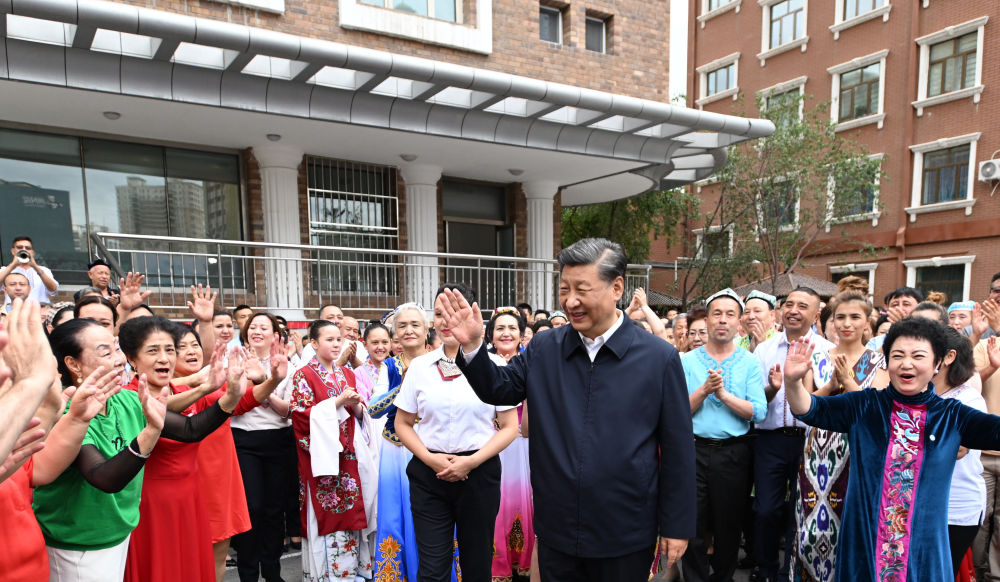 2022年7月13日上午,習(xí)近平在新疆烏魯木齊市天山區(qū)固原巷社區(qū)考察時(shí),身著民族服裝的各族群眾簇?fù)碓诳倳浬磉叄d歌載舞,向總書記表達(dá)由衷的愛(ài)戴。