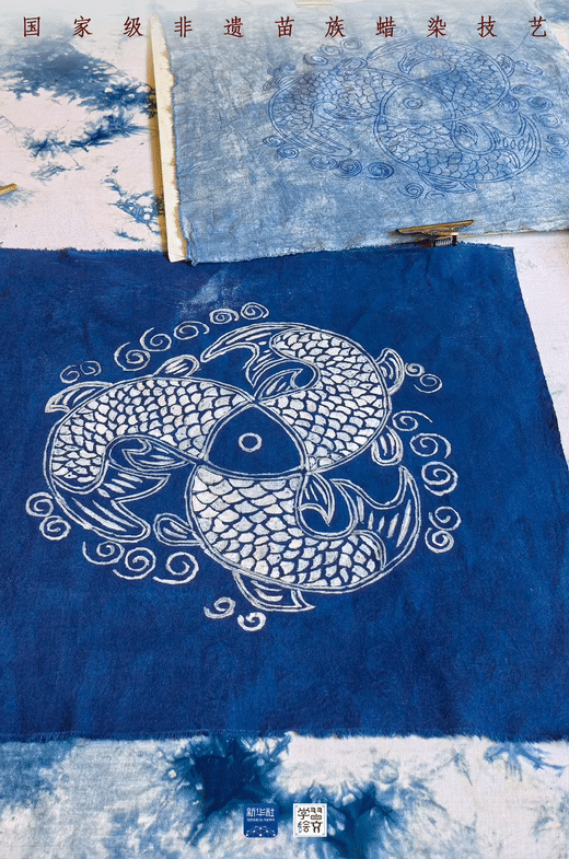 染色,就是將畫(huà)好圖案的土布,放入藍(lán)靛染缸中,反復(fù)浸泡多次,確保其上色。其間,作為防染劑的蠟自然龜裂,使布面呈現(xiàn)特殊的“冰紋”,具有獨(dú)特魅力。