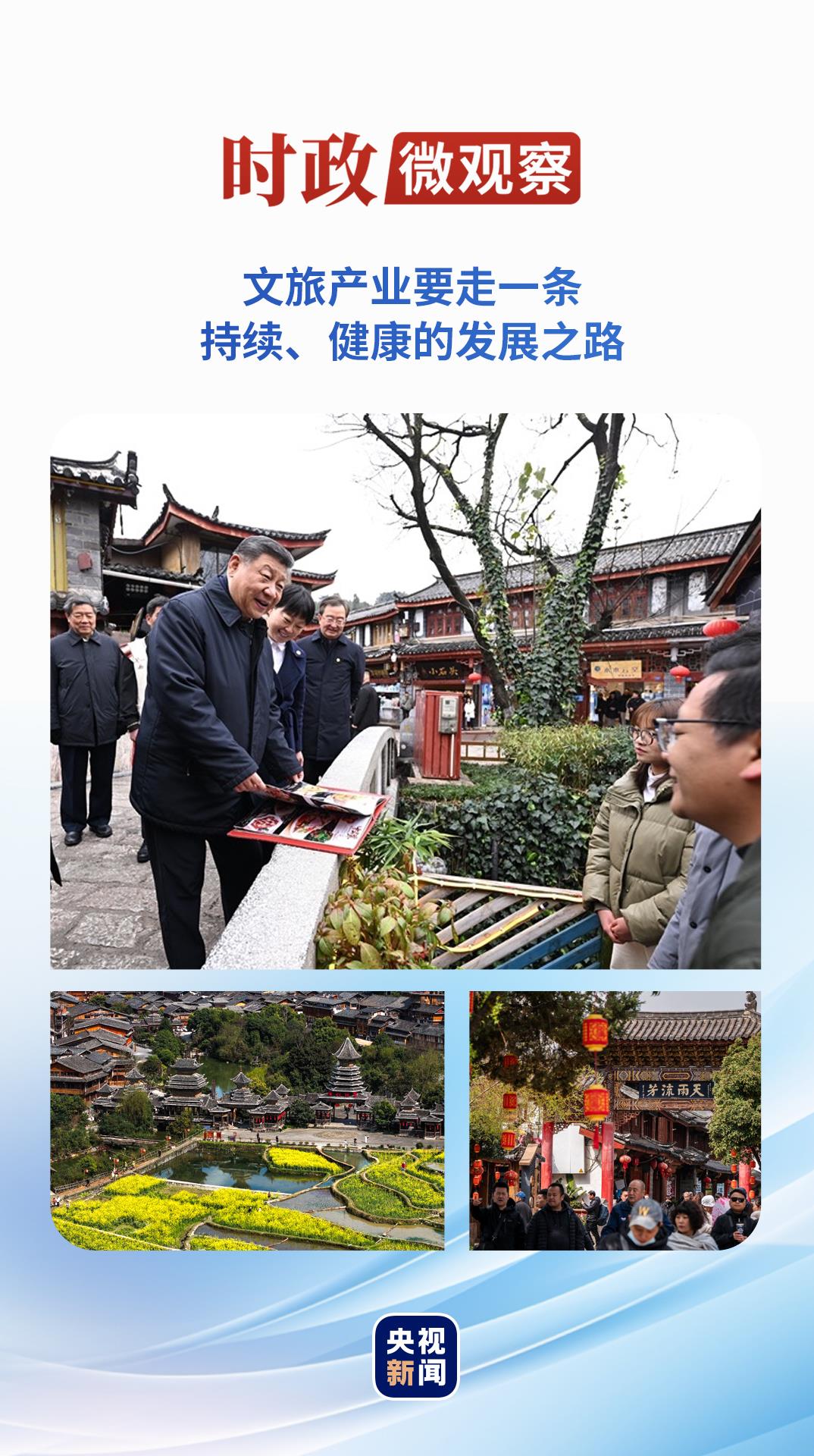 在云南麗江古城,總書(shū)記沿著石板路邊走邊看,與居民和游客親切交流:“麗江有美麗風(fēng)光,有特色文化,有很高知名度,一定能走出一條持續(xù)健康的文旅發(fā)展之路?!彼螽?dāng)?shù)靥幚砗帽Wo(hù)和發(fā)展的關(guān)系,讓這座美麗的古城煥發(fā)新的光彩。