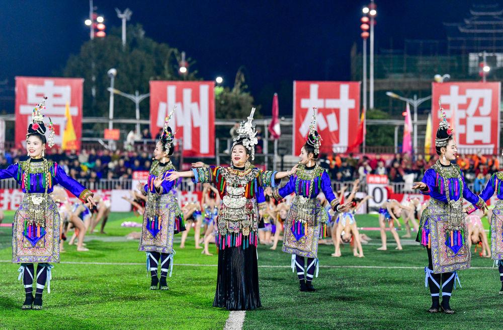 2025年3月14日,2025年貴州“村超”40強(qiáng)交叉賽在榕江“村超”足球場(chǎng)舉行,演員在比賽間隙表演侗族大歌。