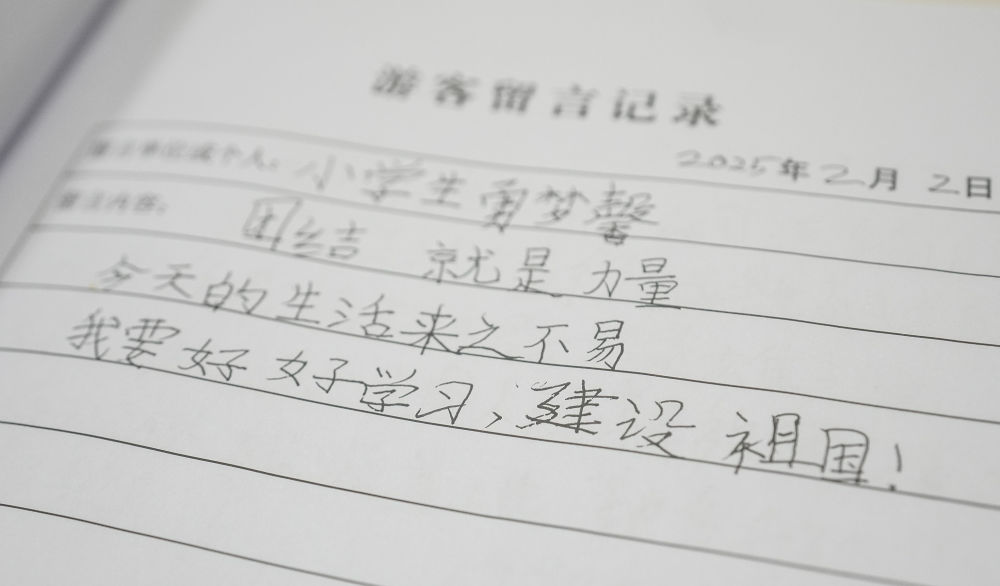 2025年4月1日,錦州市一名小學(xué)生在參觀遼寧省錦州市遼沈戰(zhàn)役紀(jì)念館后,在留言簿上留下感想