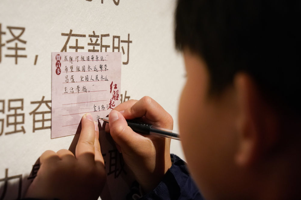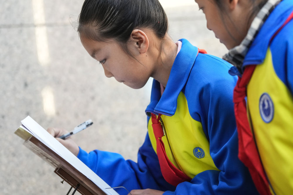 2025年3月27日,安徽省合肥市金斗路小學(xué)的學(xué)生在渡江戰(zhàn)役紀(jì)念館書寫留言卡。