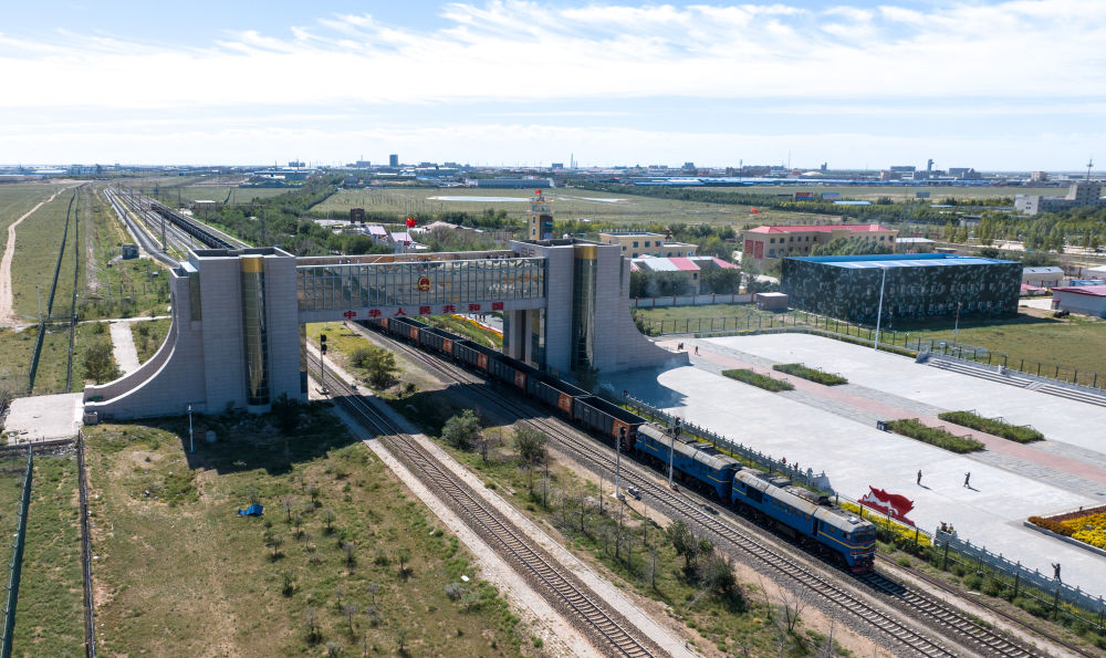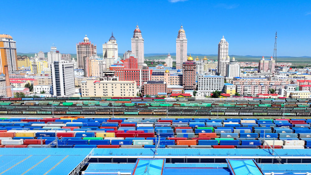 2024年8月20日,中歐班列在內(nèi)蒙古滿洲里口岸準(zhǔn)備出境(無人機(jī)照片)。滿洲里口岸位于中俄蒙三國交界處,是中國最大的陸路口岸,也是連接俄羅斯、蒙古國的重要樞紐。2024年,滿洲里口岸中歐班列通行量突破4000列,為推進(jìn)高質(zhì)量共建“一帶一路”注入新動(dòng)能。