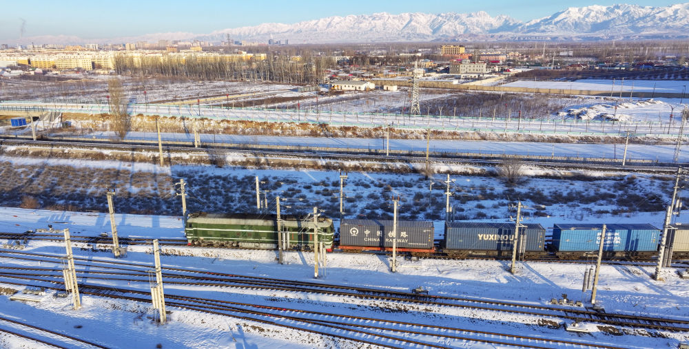 2024年12月25日,一列中歐班列經(jīng)霍爾果斯口岸駛向哈薩克斯坦(無人機(jī)照片)。霍爾果斯口岸地處伊犁哈薩克自治州、毗鄰哈薩克斯坦,是古絲綢之路北道上的千年驛站,也是近現(xiàn)代對外開放的百年口岸,更是我國面向中亞、西亞乃至歐洲的重要物流通道。2024年,該口岸中歐(中亞)班列開行量達(dá)8730列,同比增長12.5%;貨物過貨量達(dá)1208.4萬噸,同比增長10.9%;通行班列線路總數(shù)超過80條,輻射境外18個(gè)國家的46個(gè)城市。