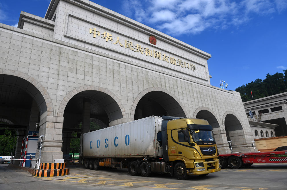 2024年8月26日,一輛貨車通過廣西憑祥友誼關(guān)口岸。友誼關(guān)口岸是西部陸海新通道的重要節(jié)點(diǎn),是中國通往東盟最大的陸路口岸,也是我國通往越南最便捷的陸路大通道之一。滿載著東盟國家特色水果、農(nóng)副產(chǎn)品與中國電子配件、大型設(shè)備等貨品的車輛在此“雙向奔赴”、川流不息。2024年,友誼關(guān)口岸年內(nèi)出入境貨車數(shù)量首次突破50萬輛次,同比增長15.96%,創(chuàng)歷史新高。