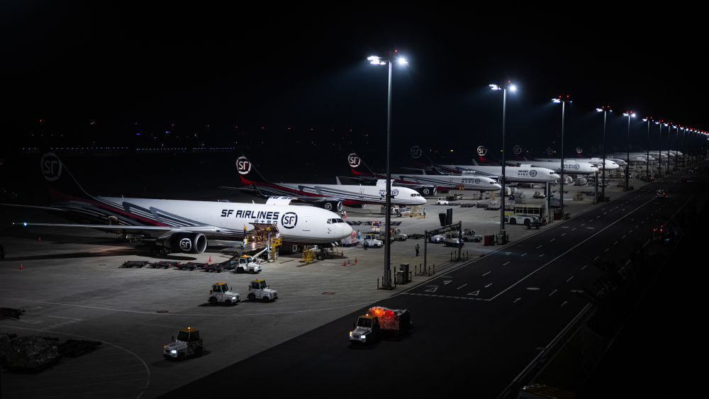 2024年5月25日凌晨,工人在湖北鄂州花湖國際機(jī)場停機(jī)坪裝卸貨物。鄂州花湖國際機(jī)場于2022年7月建成投運(yùn),是亞洲首個(gè)專業(yè)貨運(yùn)樞紐機(jī)場。截至2025年1月26日,鄂州花湖國際機(jī)場已開通37條國際貨運(yùn)航線和66條國內(nèi)貨運(yùn)航線。