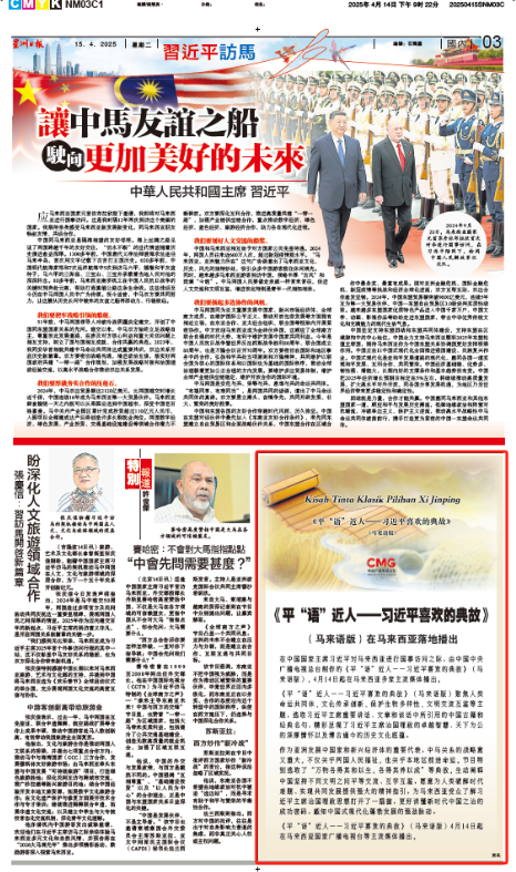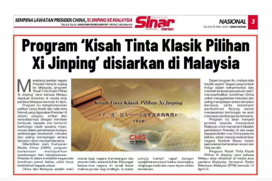 4月15日,馬來西亞中文、英文、馬來文主流媒體《星洲日報(bào)》《星報(bào)》《陽光日報(bào)》分別刊發(fā)節(jié)目在馬來西亞落播的消息。文章指出,《平“語”近人——習(xí)近平喜歡的典故》(馬來語版)特別選取了“萬物各得其和以生,各得其養(yǎng)以成”等典故,生動闡釋中國堅(jiān)持不同文明之間平等交流、互學(xué)互鑒,愿意為人類破解時代難題、實(shí)現(xiàn)共同發(fā)展提供強(qiáng)大的精神指引,有助于馬來西亞民眾更好讀懂新時代中國之治的成功密碼,感知中國式現(xiàn)代化蓬勃發(fā)展的強(qiáng)勁脈動。