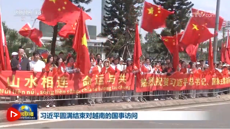 離開河內(nèi)時,越南總理范明政,越共中央政治局委員、中央書記處常務(wù)書記陳錦繡,越共中央書記處書記、中央辦公廳主任黎懷忠等越南黨政領(lǐng)導(dǎo)人和地方代表到機(jī)場送行。當(dāng)?shù)孛癖姾椭匈Y機(jī)構(gòu)、留學(xué)生代表高舉紅色橫幅,熱烈祝賀習(xí)近平訪問越南取得圓滿成功。