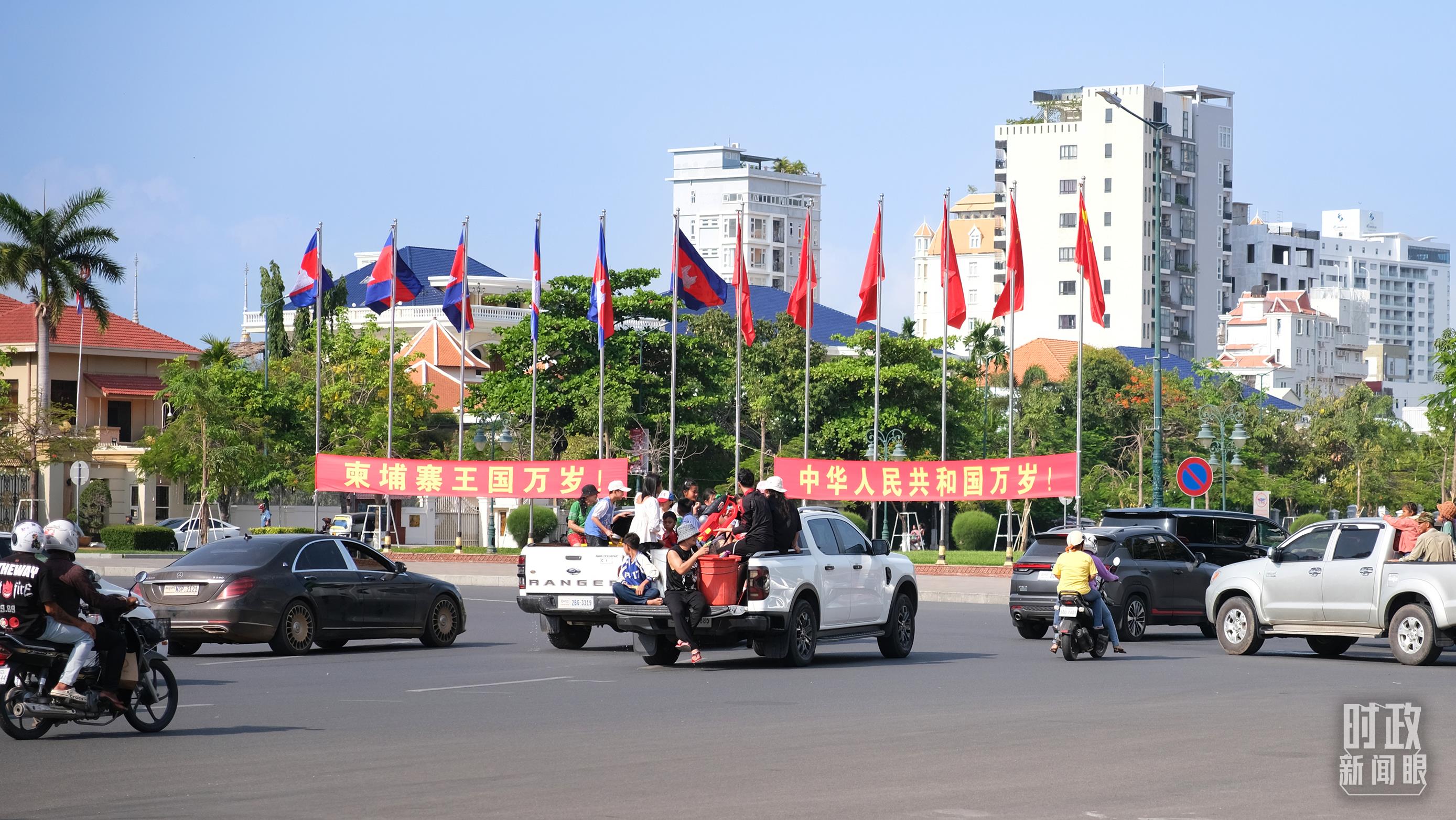 金邊街頭的兩國(guó)國(guó)旗和標(biāo)語(yǔ)。(總臺(tái)央視記者鄂介甫拍攝)