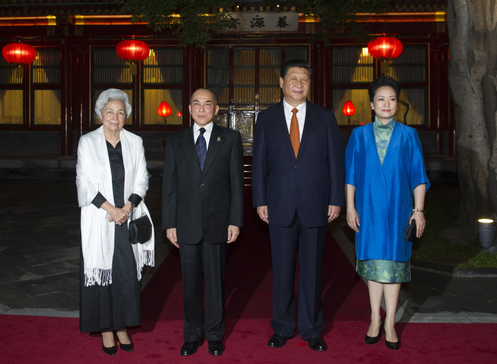 2014年9月25日晚,國家主席習(xí)近平在北京釣魚臺(tái)國賓館會(huì)見柬埔寨國王西哈莫尼和太后莫尼列。習(xí)近平主席夫人彭麗媛參加會(huì)見。