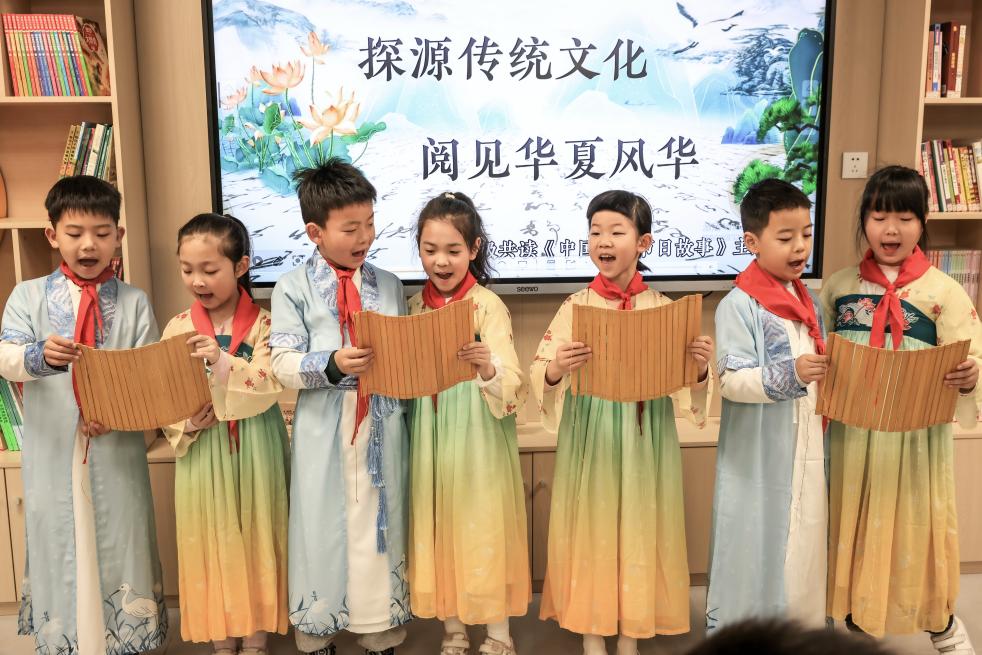 4月2日,湖北省武漢市洪山區(qū)未來實(shí)驗(yàn)小學(xué)美林校區(qū)學(xué)生在吟誦古詩。新華社發(fā)(趙軍攝)