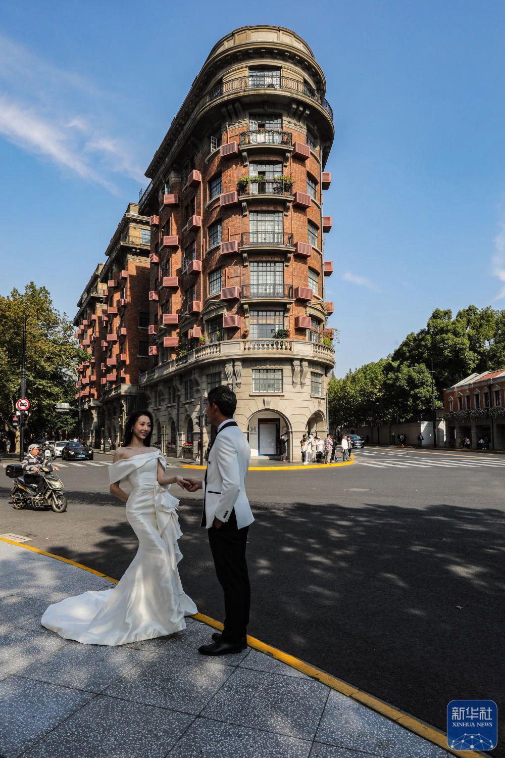 2023年11月3日,一對新人在海派文化的代表建筑武康大樓前拍攝婚紗照。