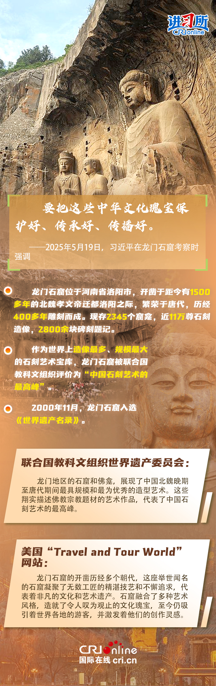 龍門石窟被聯(lián)合國(guó)教科文組織評(píng)價(jià)為“中國(guó)石刻藝術(shù)的最高峰”,與敦煌莫高窟、云岡石窟、麥積山石窟并稱為“中國(guó)四大石窟”,具有重要?dú)v史價(jià)值、文化價(jià)值。近年來(lái),習(xí)近平先后考察了中國(guó)四大石窟。對(duì)這些承載著中華民族文化基因和血脈的文物和文化遺產(chǎn),習(xí)近平強(qiáng)調(diào),“保護(hù)好、傳承好歷史文化遺產(chǎn)是對(duì)歷史負(fù)責(zé)、對(duì)人民負(fù)責(zé)?!?/p>