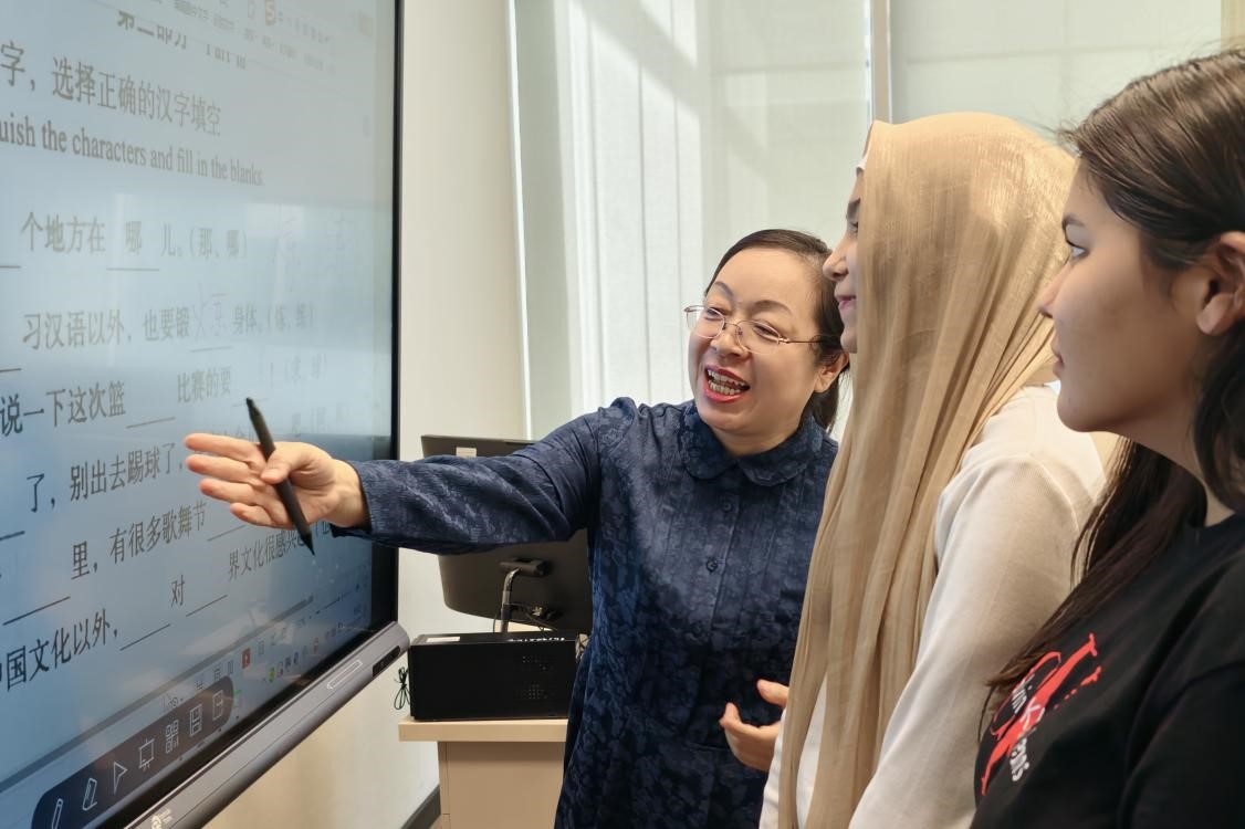 在分校的視聽(tīng)說(shuō)教室里,當(dāng)?shù)貙W(xué)生跟著中國(guó)老師有節(jié)奏地吟誦,品味經(jīng)典中國(guó)古詩(shī)詞中的韻味,感受中國(guó)文化的魅力。課堂上,學(xué)生們又將哈薩克斯坦同樣關(guān)于“友誼”的表達(dá)翻譯成中文,在分享與互動(dòng)中,提升中文能力,增進(jìn)相互理解。