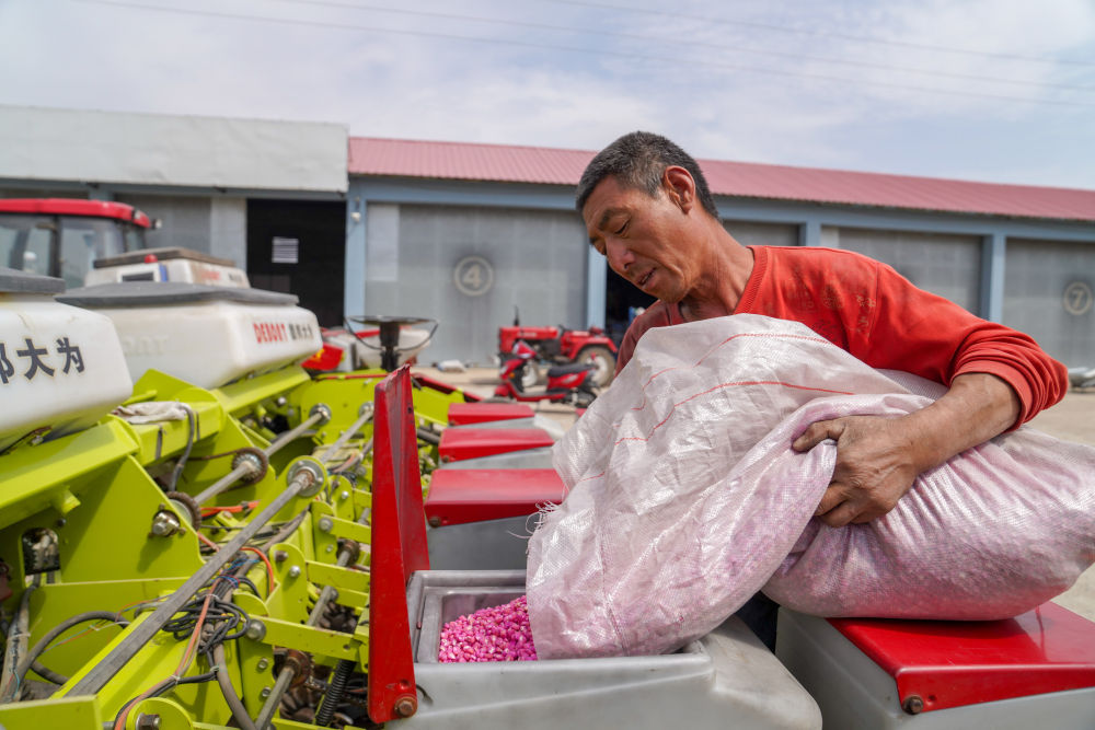 2020年5月7日,在吉林省四平市梨樹(shù)縣康達(dá)農(nóng)機(jī)農(nóng)民專(zhuān)業(yè)合作社,農(nóng)民向免耕播種機(jī)里投放玉米種子。